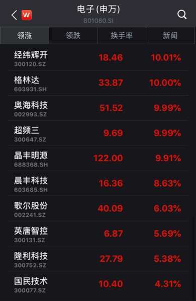 具體而言,截至收盤(pán),經(jīng)緯輝開(kāi)、超頻三漲停,晨豐科技上漲8.63%,歌爾股份、【英唐智控(300131)、股吧】、隆利科技分別上漲6.03%、5.69%、5.38%。