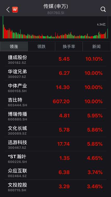 除了電子板塊,傳媒板塊也是今日較為吸睛的板塊。
