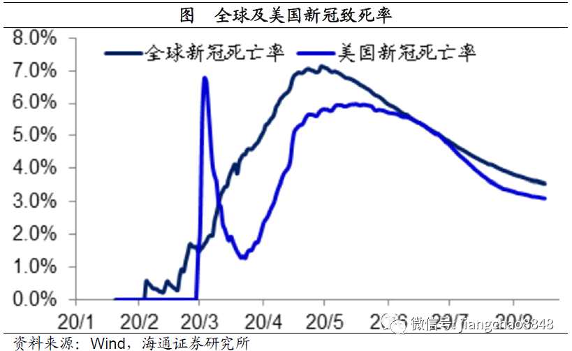 雖然目前新冠疫情并沒有結束,全球感染人數(shù)還在持續(xù)增加,而且還沒有有效的疫苗出現(xiàn)。但有一個最重要的好消息,就是新冠病毒導致的死亡率大幅下降,目前全球和美國的新冠死亡率均從峰值的7%左右降至3%左右的水平,遠低于SARS當年11%的死亡率。