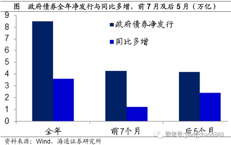 但是按照今年政府預算的規(guī)劃,全年政府債券的計劃發(fā)行總額為8.5萬億,同比多增3.6萬億。而前7個月發(fā)行了4.3萬億,同比僅多增1.2萬億。這意味著后5月的政府債券還將發(fā)行4.2萬億,同比多增2.4萬億,僅政府融資發(fā)行的多增就足以拉動未來5個月的社融增速繼續(xù)上行1%左右。
