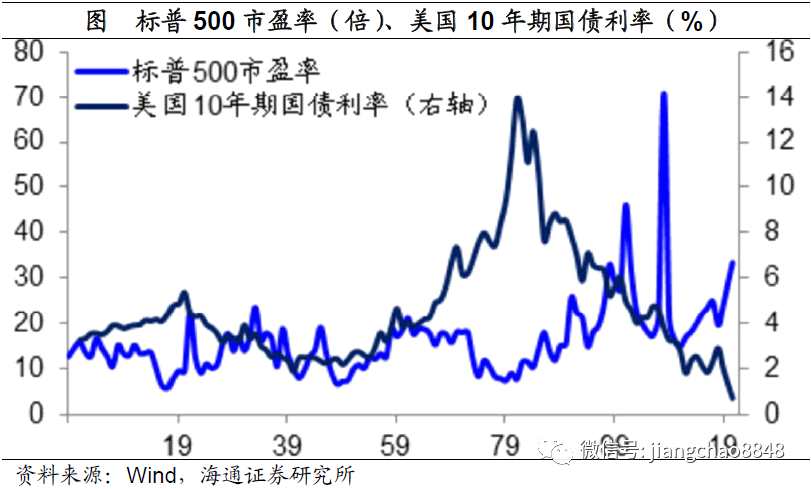 今年以來的美股上漲,最主要的貢獻是估值的提升。19年末標普500指數(shù)的TTM市盈率為24倍,到8月21日為止已經(jīng)升至33.6倍,升幅高達40%。美股估值提升的背后,利率下行是最重要的推手之一。從過去120年的歷史來看,美國標普500指數(shù)的平均市盈率為16倍,一倍標準差區(qū)間為8-24倍,目前的估值水平已經(jīng)位于兩倍標準差區(qū)間以外,假設美股估值的波動符合正態(tài)分布,那么出現(xiàn)當前這樣高估值水平的概率不到5%。事實上,在過去120年當中,只有01年和08年這兩年年末的標普500市盈率高于當前的水平。