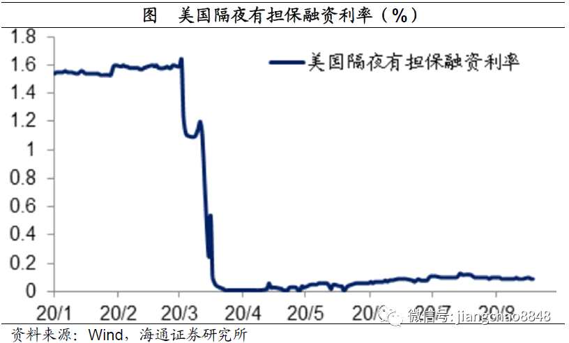 如果不實施負利率,就意味著美聯(lián)儲不會再降息。在4月份以后,美國貨幣市場利率開始從低位緩慢回升,其隔夜有擔保融資利率從3月最低的0.01%回升至8月份的0.09%。