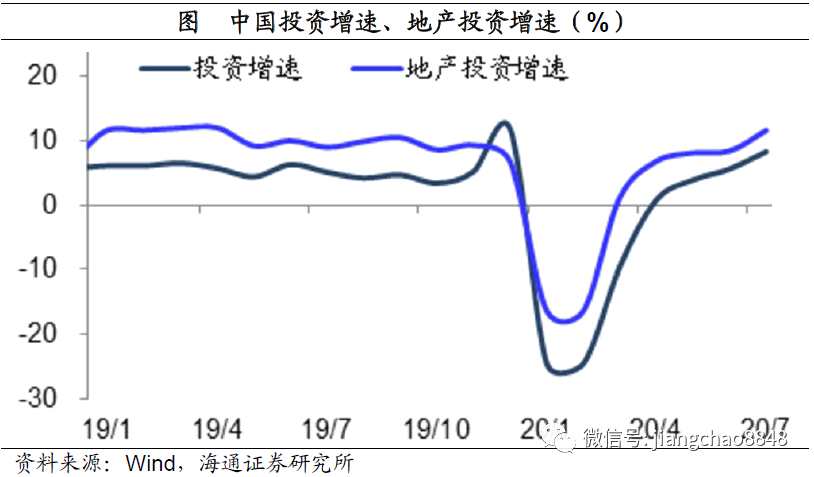 在中國,隨著疫情的改善,主要依賴于資金的投資需求最先恢復,3月份的地產(chǎn)投資增速就由負轉正,4月份的總投資增速由負轉正。