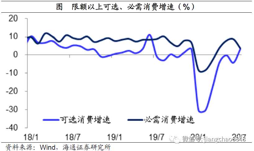 而消費的恢復相對比較慢,截止到7月份的全國零售增速降幅為1.1%,增速尚未轉正。但從限額以上消費來觀察,4月份的必需消費增速就已經(jīng)轉正,7月份的可選消費增速也首度轉正,說明各類消費需求也在持續(xù)恢復。