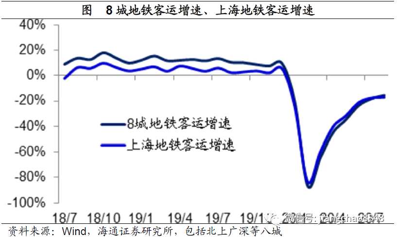 在疫情最嚴重的2月份,中國的所有出行全部大幅下滑。但從3月份開始,各類出行開始陸續(xù)恢復。其中,市內(nèi)駕車出行最先恢復正常。隨后以地鐵為代表的市內(nèi)公交出行也開始明顯恢復。我們統(tǒng)計的北上廣深等8城地鐵客運數(shù)據(jù)顯示,2月份的8城地鐵客流同比降幅超過80%,到8月初的同比降幅已經(jīng)不到20%。