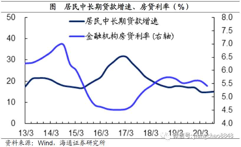在企業(yè)部門,其中長期貸款增速與庫存周期保持高度一致。上一輪的去庫存周期始于17/18年,隨著去庫存的開始,企業(yè)也減少投資,其中長期貸款增速持續(xù)下行。而從19年中期開始,庫存周期見底回升,企業(yè)中長期貸款增速也重新上行。期間雖然因為疫情的原因導致了庫存周期的短期中斷,但目前隨著疫情的平息,補庫存周期已經(jīng)重啟,有望支撐企業(yè)中長期貸款增速繼續(xù)回升。