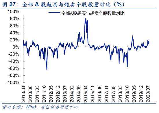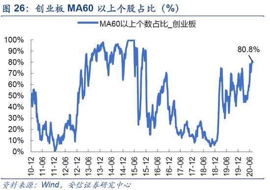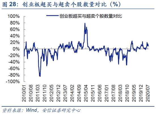 當(dāng)前市場(chǎng)強(qiáng)勢(shì)個(gè)股數(shù)量占比79.0%,較上周微增1.2個(gè)百分點(diǎn),處于近15年以來(lái)高位,而超買(mǎi)個(gè)股與超賣(mài)個(gè)股之差占比11.6%,較前周微增0.9個(gè)百分點(diǎn)。從創(chuàng)業(yè)板來(lái)看,強(qiáng)勢(shì)個(gè)股數(shù)量占比80.8%,較上周微增0.8個(gè)百分點(diǎn),同樣處于近15年以來(lái)高位,超買(mǎi)個(gè)股與超賣(mài)個(gè)股之差占比9.3%,較前周微增0.1個(gè)百分點(diǎn)。結(jié)構(gòu)來(lái)看,創(chuàng)業(yè)板震蕩盤(pán)整,主板表現(xiàn)稍強(qiáng)。