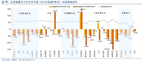 截至8月23日早上10點(diǎn),全A(含科創(chuàng)板)共1398家上市公司公布了正式中報(bào),整體披露率為35.22%。其中,主板、創(chuàng)業(yè)板和中小板披露率分別為34.18%,31.84%和34.13%。由于目前披露率不高,我們進(jìn)一步結(jié)合中報(bào)業(yè)績(jī)快報(bào)和業(yè)績(jī)預(yù)告進(jìn)行觀察,2020H1全A(整體披露率提升至58.00%)、全A非金融石油石化(披露率為58.86%)、主板(48.55%)、創(chuàng)業(yè)板(57.70%)和中小板(75.44%)增速分別為-24.17%、-23.15%、-31.56%、12.91%和-10.46%,環(huán)比均較2020Q1大幅回升。