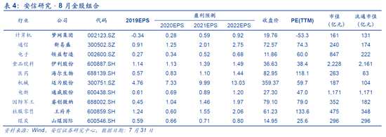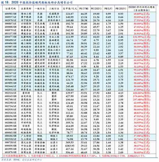 伴隨當(dāng)前經(jīng)濟(jì)復(fù)蘇,低估值順周期板塊機(jī)會(huì)有望擴(kuò)散,我們維持重點(diǎn)關(guān)注化工(化學(xué)化纖、化學(xué)制品)與機(jī)械(專(zhuān)用設(shè)備和通用機(jī)械)電氣設(shè)備(電源設(shè)備(光伏、風(fēng)電)、高低壓設(shè)備)領(lǐng)域的周期成長(zhǎng)股機(jī)會(huì)。7月PPI進(jìn)一步修復(fù)至-2.4%;同時(shí),PMI連續(xù)5個(gè)月處于擴(kuò)張區(qū)間,工業(yè)企業(yè)整體庫(kù)存數(shù)據(jù)正在下滑,目前處于被動(dòng)去庫(kù)存階段。其中,部分細(xì)分行業(yè)有望進(jìn)入階段性主動(dòng)補(bǔ)庫(kù)存,周期行業(yè)存在結(jié)構(gòu)性機(jī)會(huì)。我們認(rèn)為當(dāng)前重點(diǎn)關(guān)注庫(kù)存下降,且產(chǎn)品價(jià)格出現(xiàn)上升的化工行業(yè)(化學(xué)化纖、化學(xué)制品,包括PTA、PVC、MDI)以及周期成長(zhǎng)型細(xì)分,主要集中在機(jī)械行業(yè)(專(zhuān)用設(shè)備和通用機(jī)械,例如工程機(jī)械、工業(yè)機(jī)器人,7月挖掘、鏟土運(yùn)輸機(jī)械和工業(yè)機(jī)器人產(chǎn)量分別增長(zhǎng)46.1%、19.4%。)以及電氣設(shè)備(電源設(shè)備、高低壓設(shè)備,例如2020年風(fēng)電、光伏平價(jià)項(xiàng)目總裝機(jī)規(guī)模翻番)。