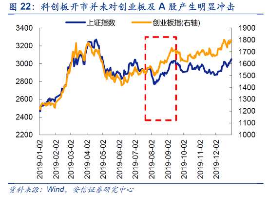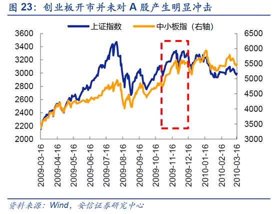 從歷史經(jīng)驗(yàn)來(lái)看,回顧2009年創(chuàng)業(yè)板以及2019年科創(chuàng)板開(kāi)市其他指數(shù)的漲幅情況,我們發(fā)現(xiàn)未顯著影響股市流動(dòng)性。2019年科創(chuàng)板成立首批25家公司同時(shí)上市,上證綜指在7月22日(T)及之后的漲跌幅分別為-1.27%(T)、+0.45%(T+1)、+0.80%(T+2)、+0.48%(T+3),創(chuàng)業(yè)板指漲跌幅分別為-1.69%(T)、+1.25%(T+1)、+1.22%(T+2)、+0.80%(T+3),T日下跌但后面3日連續(xù)上漲;2009年創(chuàng)業(yè)板成立首批28家公司同時(shí)上市,上證綜指在10月30日(T)及之后的漲跌幅分別為+1.20%(T)、+2.70%(T+1)、+1.22%(T+2)、+0.46%(T+3),連續(xù)上漲。綜合來(lái)看,分流效應(yīng)僅在第一天造成短暫沖擊,A股中期上升趨勢(shì)并未改變。