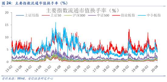 換手從換手率來(lái)看,本周主要指數(shù)換手率均小幅回落,上證綜指、上證50、滬深300、萬(wàn)得全A換手率在90%分位以下,中小創(chuàng)換手率在60%分位以下。本周上證綜指,中小板指,創(chuàng)業(yè)板指,上證50,滬深300,中證500,萬(wàn)得全A的流通市值換手率分別為1.32%,4.50%,5.07%,0.58%,0.92%,2.02%,1.65%,分別較前周變動(dòng)-0.02,-0.21,-0.21,-0.04,-0.03,-0.04,-0.05個(gè)百分點(diǎn),分別處在86%,55%,40%,86%,84%,73%,81%分位數(shù)水平,主要指數(shù)換手率均有均小幅回落。