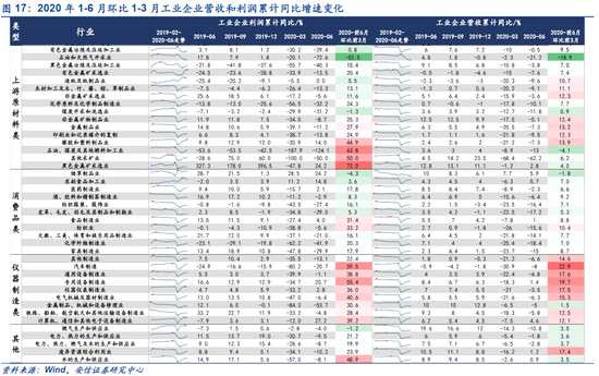 從工業(yè)企業(yè)利潤(rùn)角度來(lái)看,2020年1-6月累計(jì)同比兩位數(shù)增長(zhǎng)的有上游原材料類(lèi)中的黑色金屬礦采選業(yè)(24.2%),橡膠和塑料制品業(yè)(14.0%),消費(fèi)品類(lèi)中的煙草制品業(yè)(24.2%)、農(nóng)副食品加工業(yè)(14.8%),儀器制造類(lèi)中的計(jì)算機(jī)、通信和其他電子設(shè)備制造業(yè)(27.2%)、專(zhuān)用設(shè)備制造業(yè)(20.7%)。同時(shí),1-6月環(huán)比1-3月累計(jì)同比增速變化靠前的行業(yè)有:黑色金屬礦采選業(yè)(72.0 pct)、石油、煤炭及其他燃料加工業(yè)(63.8%)、汽車(chē)制造(59.5%)、專(zhuān)用設(shè)備制造業(yè)(55.4 pct)、橡膠和塑料制品業(yè)(44.9 pct)、計(jì)算機(jī)、通信和其他電子設(shè)備制造業(yè)(39.2 pct)等。