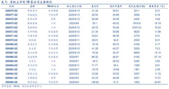 我們可以估算18家公司首個(gè)交易日成交額來(lái)粗略判斷創(chuàng)業(yè)板注冊(cè)制開(kāi)閘對(duì)市場(chǎng)流動(dòng)性的影響。從18家公司募資情況來(lái)看,融資總額200.64億元,其中戰(zhàn)略配售3.07億、網(wǎng)下配售100. 90億、網(wǎng)上配售96.69億,其中戰(zhàn)略配售和網(wǎng)下配售10%的賬戶(hù)無(wú)法在首日賣(mài)出。測(cè)算得到13.16億元市值的新股將被鎖定,首個(gè)交易日可流通的市值為187.50億元。其次假定首日換手率為77%(以科創(chuàng)板首批25家上市交易首日的情況作為參考)。根據(jù)去年科創(chuàng)板首日漲幅假設(shè)交易均價(jià)達(dá)發(fā)行價(jià)140%,則預(yù)計(jì)首日成交額為346.5億元,約占目前兩市總成交額3.87%,因此流動(dòng)性沖擊不大。去年科創(chuàng)板上市當(dāng)天,25只新股平均漲幅140%,市場(chǎng)總成交額高達(dá)485億元,占全A當(dāng)日成交金額11.7%。