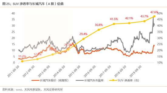 2012年至2015年初-SUV滲透率加速提升:滲透率突破10%,同時長城汽車估值抬升,股價快速上漲。