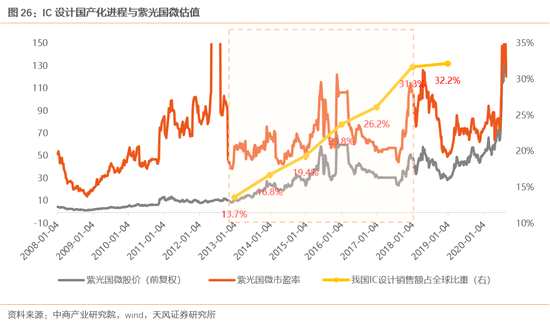 2013年至2018年初-國產(chǎn)占比迅速抬升階段(13%-32%):1)2012年末我國IC設計銷售額占全球比重達到13.7%,紫光國微股價和估值開始快速抬升。2)2015年下半年至2016年受股災影響大幅殺估值。3)2017年下半年再度抬估值,高點出現(xiàn)在2018年4月,隨后隨大盤調整。到2017年末國產(chǎn)比重突破30%,達到31.8%。