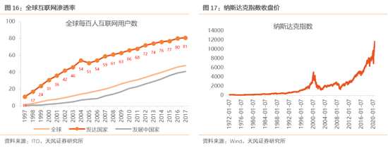 我們分別以互聯(lián)網(wǎng)發(fā)展歷程中硬件和軟件領域的代表性公司IBM、微軟為例,結合全球每百人互聯(lián)網(wǎng)用戶數(shù)和美國PC擁有率兩項數(shù)據(jù)確定滲透率提升的節(jié)點,觀察估值的變化過程。從數(shù)據(jù)上看,第一,硬件領域(PC等)的滲透要早于互聯(lián)網(wǎng)的應用;第二,全球范圍內發(fā)達國家互聯(lián)網(wǎng)滲透率領先于發(fā)展中國家,加速滲透的階段分別是上世紀90年代和本世紀初。