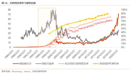 1990年至1995年-PC滲透率繼續(xù)提升,互聯(lián)網(wǎng)初步滲透:這一階段IBM股價和估值步入調整期?;ヂ?lián)網(wǎng)大眾化尚在初期,數(shù)據(jù)顯示1997年末發(fā)達國家互聯(lián)網(wǎng)滲透率為11%,則預計1995年之前在8%以下,微軟股價和市盈率緩慢抬升。