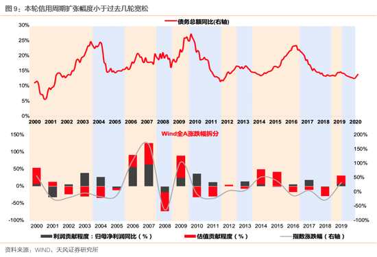 經(jīng)濟周期扁平化同時對應政策周期的扁平化。從以債務總額同比衡量的信用擴張-收縮周期可以看到,2000年以來我們至少經(jīng)歷了六輪比較明顯的信用擴張周期,其中2000-2003、2008-2009、2014-2016是大級別的信用擴張;2006-2007、2012-2013屬于信用企穩(wěn)后的小級別擴張。而本輪信用周期擴張從2019年起,始終維持脈沖式的、應對式的投放。上半年疫情重挫國內經(jīng)濟并干擾了財政貨幣政策節(jié)奏,而隨著經(jīng)濟數(shù)據(jù)逐步恢復,政策面也及時表態(tài)特殊時期的政策工具要適時退出。未來較長一個階段信用周期可能都會維持在一個并不寬闊的區(qū)間內。