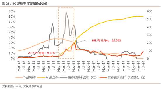 2015年-4G快速滲透:2015年4G滲透率由年初的9%迅速提高至年末的30%,這一年富春股份股價和估值快速提升,即使有下半年的股災,依然在年末創(chuàng)下股價歷史高點。