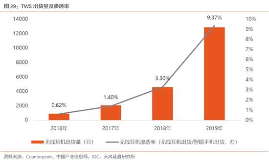 TWS:2019年發(fā)展迅猛,滲透率接近10%,處于成長階段的初期;