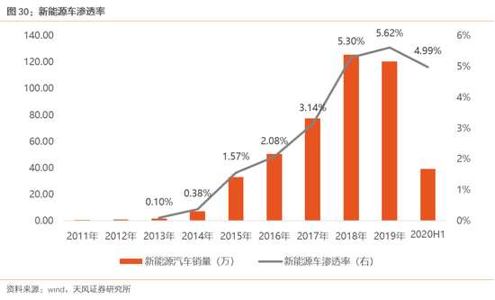 新能源車是國家戰(zhàn)略新興產(chǎn)業(yè)規(guī)劃確立的五大方向之一,也是2011年以來中央政府采取廣泛補貼政策的重點支持領域。以新車銷量計算,2019年末新能源車滲透率只有5.62%,2020年上半年為4.99%,尚處于初始滲透階段。上半年由于疫情的影響,耐用品消費領域受到較大沖擊。后續(xù)隨著經(jīng)濟活動逐步恢復,加上政策面對家電、汽車等消費領域的刺激和補貼,新能源車銷量有望快速復蘇,并逐步提高滲透率。