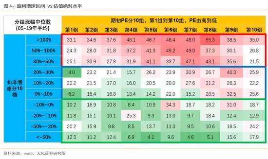 ?。?)對于成長期企業(yè)(增速>30%),買入估值對未來一年股價區(qū)分度不強,最終都是表現(xiàn)最好的公司;對于穩(wěn)定期企業(yè)(增速在0-30%),買入估值對未來一年股價區(qū)分度較強,買入估值較低的板塊未來一年表現(xiàn)要好于買入估值較高的板塊;