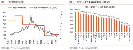 在經(jīng)濟增速降檔、實際利率中樞下移的狀態(tài)下,美股在風格上也出現(xiàn)了一定的“鈍化”,表現(xiàn)為科技和消費的長期趨勢性占優(yōu)。1973年以來,美股年化收益最高的行業(yè)集中于消費和科技:航空國防10.9%、軟件10.8%、休閑旅游9.8%、零售業(yè)9.8%、電子設備9.4%、衛(wèi)生保健9.3%、食品藥品零售9.2%、食品飲料8.9%。