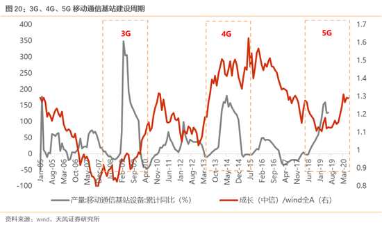 以移動基站建設周期和牌照發(fā)放情況來看,第三代到第五代移動通信技術大約以5年為一周期,然后傳導到用戶端的滲透率。并且歷代移動通信技術的革新都會帶來一次以成長股的牛市: