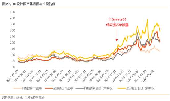 國產(chǎn)化進程中的標志性事件也會帶來板塊即個股估值的抬升。比如2019年兆易創(chuàng)新、【圣邦股份(300661)、股吧】等進入華為mate30供應鏈名單,進一步催化了本輪半導體及元件概念行情。