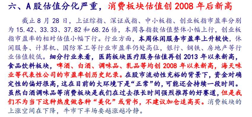 但是在消費股一片“炙手可熱”之際,銀河證券近期發(fā)布的一份策略研報卻開始在市場上引發(fā)激烈反響。8月29日,銀河證券發(fā)布策略周報《創(chuàng)業(yè)板注冊制首周上漲,不為創(chuàng)紀(jì)錄的消費股再唱贊歌》,對大多市場人士熱捧的板塊“潑冷水”,直言消費板塊估值已創(chuàng)新高,意味著投資回報率下降。