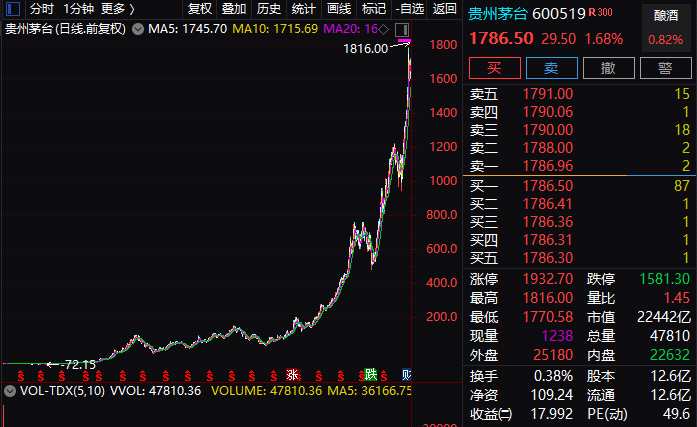 8月31日,A股再現(xiàn)跳水情形,三大股指均表現(xiàn)不佳,但消費股依然牛氣沖天,漲幅居前,食品飲料板塊整體上漲1.09%,居行業(yè)前列。其中,白酒消費股有突出表現(xiàn),尤以貴州茅臺為代表,股價一度拉升到1800元關(guān)口,再創(chuàng)歷史新高,截至收盤,貴州茅臺股價報1786.5元,總市值接近2.24萬億元。