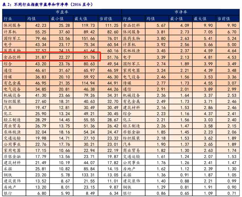 據(jù)銀河研報數(shù)據(jù),2016年至今,食品飲料行業(yè)的市盈率均值為31.87倍,最大值為51.76倍,就是當(dāng)下的市盈率。這個市盈率水平僅次于休閑服務(wù)業(yè)、計算機(jī)、國防軍工、電子、醫(yī)藥生物等,但是是少有的市盈率創(chuàng)歷史新高的板塊。