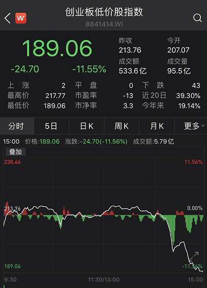 然而尾盤,創(chuàng)業(yè)板低價股指數(shù)急速跳水,1個小時猛跌超10%,最終收跌11.55%。A股市場也首次出現(xiàn)指數(shù)跌超10%的情景: