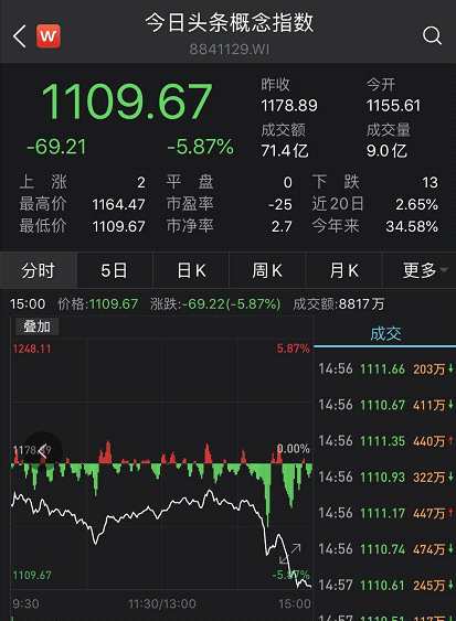 今日頭條概念指數(shù)也在尾盤殺跌,收跌5.87%。