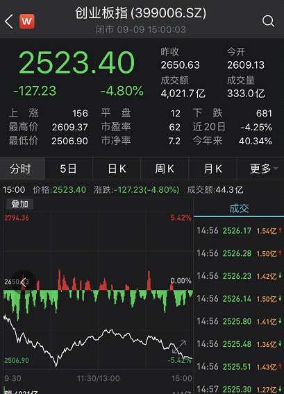 創(chuàng)業(yè)板綜指收跌4.8%,成交金額超4000億元創(chuàng)歷史新高。