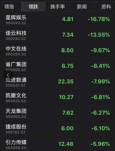 星輝娛樂暴跌超16%,佳云科技、【中文在線(300364)、股吧】、省廣集團(tuán)等紛紛跌幅居前。