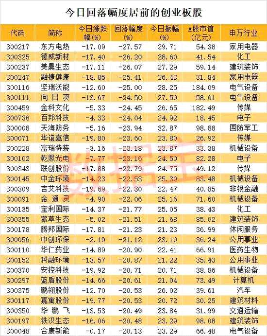 整體來看,振幅較大的基本上都是近期熱炒的創(chuàng)業(yè)板低價(jià)股,且從收盤表現(xiàn)來看,不少低價(jià)股出現(xiàn)大幅回落。數(shù)據(jù)寶統(tǒng)計(jì)顯示,與今日最高價(jià)相比,29股回落幅度超過20%,包括東方電熱、德威新材、美晨生態(tài)、融捷健康、堅(jiān)瑞沃能等。
