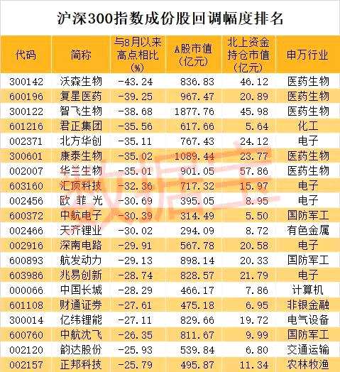 截至最新收盤,與8月以來高點(diǎn)相比,51只滬深300指數(shù)成份股回調(diào)幅度超過20%。回調(diào)幅度最大的是沃森生物,8月6日該股創(chuàng)下歷史高點(diǎn),迄今累計(jì)回調(diào)43.24%。復(fù)星醫(yī)藥、智飛生物、康泰生物、華蘭生物等醫(yī)藥股回調(diào)幅度也在30%以上。芯片概念股北方華創(chuàng)、匯頂科技分別回調(diào)35.11%、32.36%。