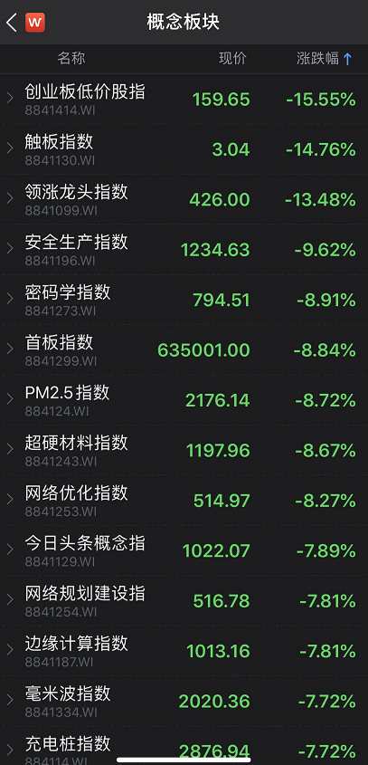 此前熱炒的各大概念板塊也受重挫。其中,今日頭條概念指數(shù)暴跌7.89%。