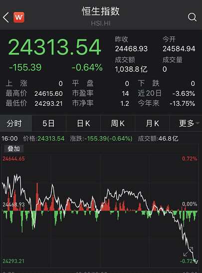 A股收盤后,恒生指數(shù)和恒生中國企業(yè)指數(shù)紛紛走綠。最終收跌0.64%。