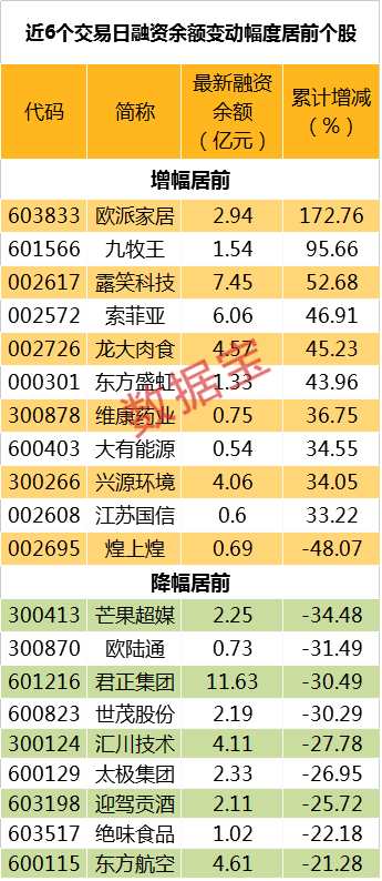 不過仍有24股融資余額增幅超20%。期間,歐派家居融資余額增幅變現(xiàn)最突出,最新融資余額為2.94億元,增長172.76%;其次是九牧王,最新融資余額1.54億元,增幅為95.66%,融資余額增幅居前的還有露笑科技、索菲亞等。