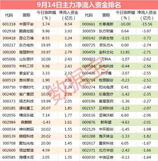 中國平安主力資金凈流入居首