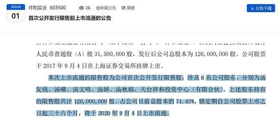 耐人尋味的是,2017年9月上市的祥和實業(yè),現(xiàn)如今恰好到了大股東解禁的窗口期。實控人家族湯友錢、湯嘯、湯文鳴、湯嬌、湯秋娟、天臺祥和投資中心(有限合伙)合計持有的占總股本71.43%的股份,于9月4日起上市流通。