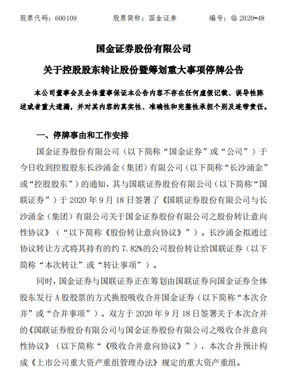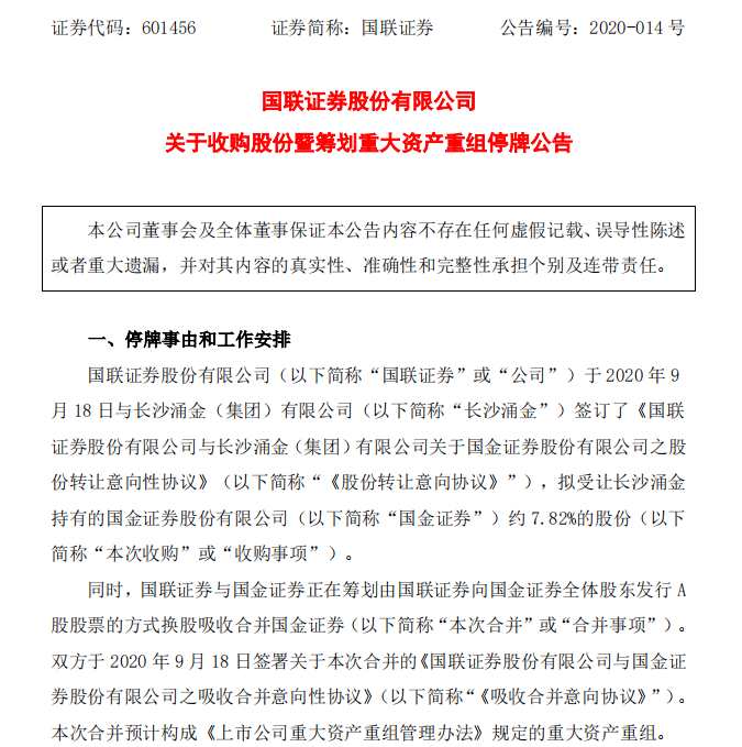 9月20日下午,國聯(lián)證券、國金證券同日公告稱,國聯(lián)證券擬受讓長沙涌金持有的國金證券約7.82%股份,同時國聯(lián)證券向國金證券全體股東發(fā)行A股股票的方式換股吸收合并國金證券,股票雙雙停牌。