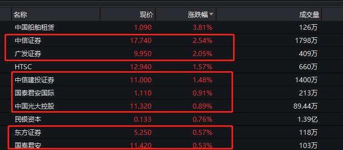 當天港股市場,中資券商股集體走前;中信證券、中信建投、招商證券港股先后漲超3%以上,臨近午盤,漲幅略有回落。