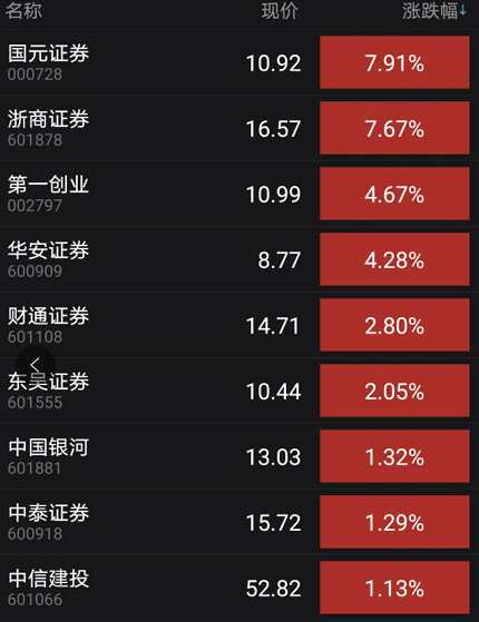 而在A股市場,券商股同樣迎來大幅高開。早盤開盤幾分鐘后,國元證券、浙商證券快速沖上漲停,哈高科逼近漲停,第一創(chuàng)業(yè)、財通證券、【中泰證券(600918)、股吧】、中信建投、中銀證券集體高開。隨后,券商板塊漲幅略有回落。