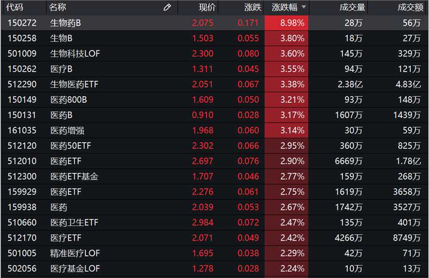 在海外公共衛(wèi)生事件擴散消息的影響下,市場資金回流到近期回調(diào)多日的醫(yī)療板塊,疫苗、體外診斷、醫(yī)療行業(yè)、精準醫(yī)療等醫(yī)藥相關板塊漲幅居前。申萬醫(yī)藥生物行業(yè)漲幅為2.62%,在申萬一級行業(yè)中位居第二位。場內(nèi)主題基金同樣飄紅,其中,生物藥B(150272.SZ)漲近9%,生物B(150258.SZ)、生物科技LOF等漲幅超過3%。