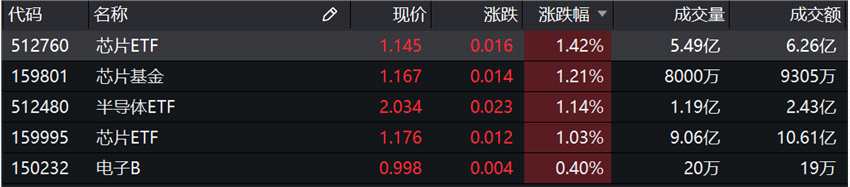 除此之外,第三代半導體再度拉升,捷捷微電(300623.SZ)漲逾10%,申萬電子行業(yè)漲幅為0.67%。場內(nèi)電子主題基金方面,芯片ETF、芯片基金、半導體ETF漲幅超過1%。消息面上,有媒體報道稱,第三代半導體有望納入“十四五”規(guī)劃。