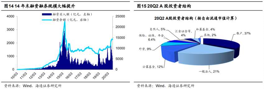 這次再平衡的幅度將小于14年底。我們判斷當(dāng)前再平衡已經(jīng)走在路上,但幅度上沒有14年底劇烈:一方面,中國經(jīng)濟(jì)轉(zhuǎn)型升級比之前更進(jìn)一步,投資者對于產(chǎn)業(yè)轉(zhuǎn)型升級的中期趨勢更加堅定,另一方面,機(jī)構(gòu)投資者占比上升,市場的波動性比以前小。具體而言,第一方面,當(dāng)前經(jīng)濟(jì)結(jié)構(gòu)與14年相比差異較大,產(chǎn)業(yè)轉(zhuǎn)型升級加速中。當(dāng)前服務(wù)業(yè)已經(jīng)成為第一大經(jīng)濟(jì)部門,2019第三產(chǎn)業(yè)占比達(dá)59.4%,而2014年第三產(chǎn)業(yè)占比僅48.2%,從三大需求對GDP增長的貢獻(xiàn)率看,最終消費(fèi)也已經(jīng)成為經(jīng)濟(jì)增長的第一動力,2019年最終消費(fèi)支出對GDP增長貢獻(xiàn)率分別為57.8%,2014年最終消費(fèi)貢獻(xiàn)率僅50.2%,宏觀經(jīng)濟(jì)結(jié)構(gòu)的變化必然會帶來產(chǎn)業(yè)發(fā)展重心的轉(zhuǎn)移,因此在未來產(chǎn)業(yè)賽道中傳統(tǒng)強(qiáng)周期、階段性復(fù)蘇行業(yè)空間有限。第二方面,當(dāng)前機(jī)構(gòu)投資者占比有所提升,外資地位逐漸提升。A股自由流通市值口徑下,20Q2機(jī)構(gòu)占比為30.7%(公募11.5%、外資8.9%、保險類資金6.4%、私募3.9%),相較于14Q4的14.7%有很大提升。值得注意的是外資占比提升明顯,外資最早進(jìn)入A股是通過2002年建立的QFII制度,但是資金量一直不大,直到2014年開通滬股通以及2016年開通深股通后,外資才開始加速流入。2018年以來,由于MSCI與FTSE先后將A股納入其指數(shù)體系,外資持股規(guī)模進(jìn)一步加大,截止20Q2外資占自由流通市值比重為8.9%,已是僅次于公募的第二大機(jī)構(gòu)投資者,而14Q3外資占比僅3%左右,外資通常持偏長期的投資思路,對于國內(nèi)投資思路影響較大,促使市場更關(guān)注中長期的產(chǎn)業(yè)賽道,從而有利于市場的穩(wěn)定。