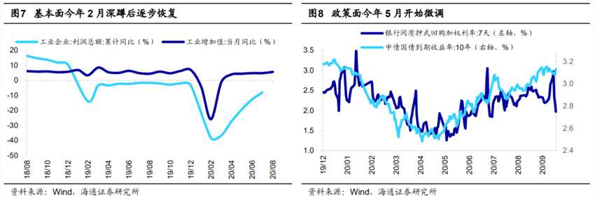 中期牛市3浪上漲趨勢不變。最近一周市場下跌,成交量進(jìn)一步萎縮,主要原因是國慶長假來臨,大家對地緣政治、美股等因素有擔(dān)憂,因此投資者傾向于持幣觀望。最近一周全部A股日成交額只有大約6000億,和7月高點(diǎn)的1.7萬多億相比只有1/3,我們之前統(tǒng)計過牛市中調(diào)整結(jié)束時成交量大約較前期高點(diǎn)萎縮到30-40%,這次調(diào)整已近尾聲。部分投資者擔(dān)憂未來美股下跌可能會使得外資流出從而影響A股,18年國慶后股市的大跌仍讓人心有余悸。我們認(rèn)為現(xiàn)在美股對A股的影響不會有18年那么大,因為從資金面看,過去幾年外資是主要的增量資金,內(nèi)資或是緊平衡,或是流出。但是今年不同,我們在《有多少水可以進(jìn)來?——再論資金入市-20200805》中做過測算,今年上半年股市資金凈流入6000多億,其中外資只有1000多億,今年外資對股市的影響相對往年會較小。未來關(guān)注影響外盤的重要因素,較為關(guān)鍵的時間節(jié)點(diǎn)有:9月29日第一次總統(tǒng)辯論、10月7日副總統(tǒng)辯論、10月15日第二次總統(tǒng)辯論、10月22日第三次總統(tǒng)辯論以及11月3日的大選。站在中期視角看,2019年初上證綜指2440點(diǎn)是第六輪牛市的起點(diǎn)。按照市場上漲時的動力是來自盈利還是估值,我們可以將每輪牛市劃分為孕育期(包括牛市1浪上漲+2浪回調(diào))、爆發(fā)期(3浪上漲+4浪回調(diào))、泡沫期(5浪沖頂)三個階段。19年屬于牛市孕育期,主要由估值驅(qū)動,原本企業(yè)盈利在19年末開始隨庫存周期啟動而向上,但是疫情使得盈利回升延后。今年下半年基本面已經(jīng)開始逐步修復(fù),資金面+基本面雙輪驅(qū)動使得市場進(jìn)入牛市3浪上漲階段。我們判斷當(dāng)前資金面和基本面向好的兩大因素未變,因此牛市3浪上漲趨勢不變。資金面上,宏觀流動性如前所述當(dāng)前仍保持寬松,微觀流動性方面,今年在房住不炒和股權(quán)融資大發(fā)展的背景下居民資產(chǎn)配置有望進(jìn)一步轉(zhuǎn)向股市。基本面上,周期和政策因素推動下我們預(yù)計基本面將繼續(xù)回升,Q3/Q4單季凈利潤同比增速有望分別達(dá)13%、20%,全年同比有望達(dá)到0-5%。真正需要擔(dān)心的風(fēng)險是隨著經(jīng)濟(jì)逐步復(fù)蘇,通脹壓力抬升導(dǎo)致貨幣政策轉(zhuǎn)向,屆時市場恐將迎來3浪上漲后的4浪回調(diào)。從歷史經(jīng)驗上看,一般CPI或PPI達(dá)到3%附近可能會觸發(fā)貨幣政策收緊,現(xiàn)在開始擔(dān)憂貨幣政策收緊為時過早,明年上半年需重視。